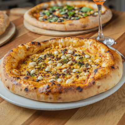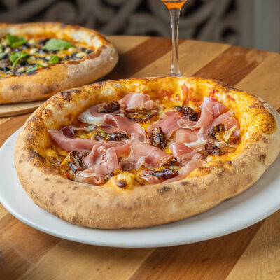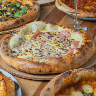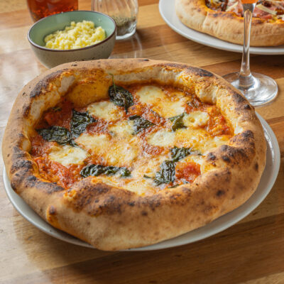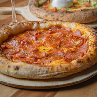 Pizza napolitana tradicional con cornicioni y base pomodoro.