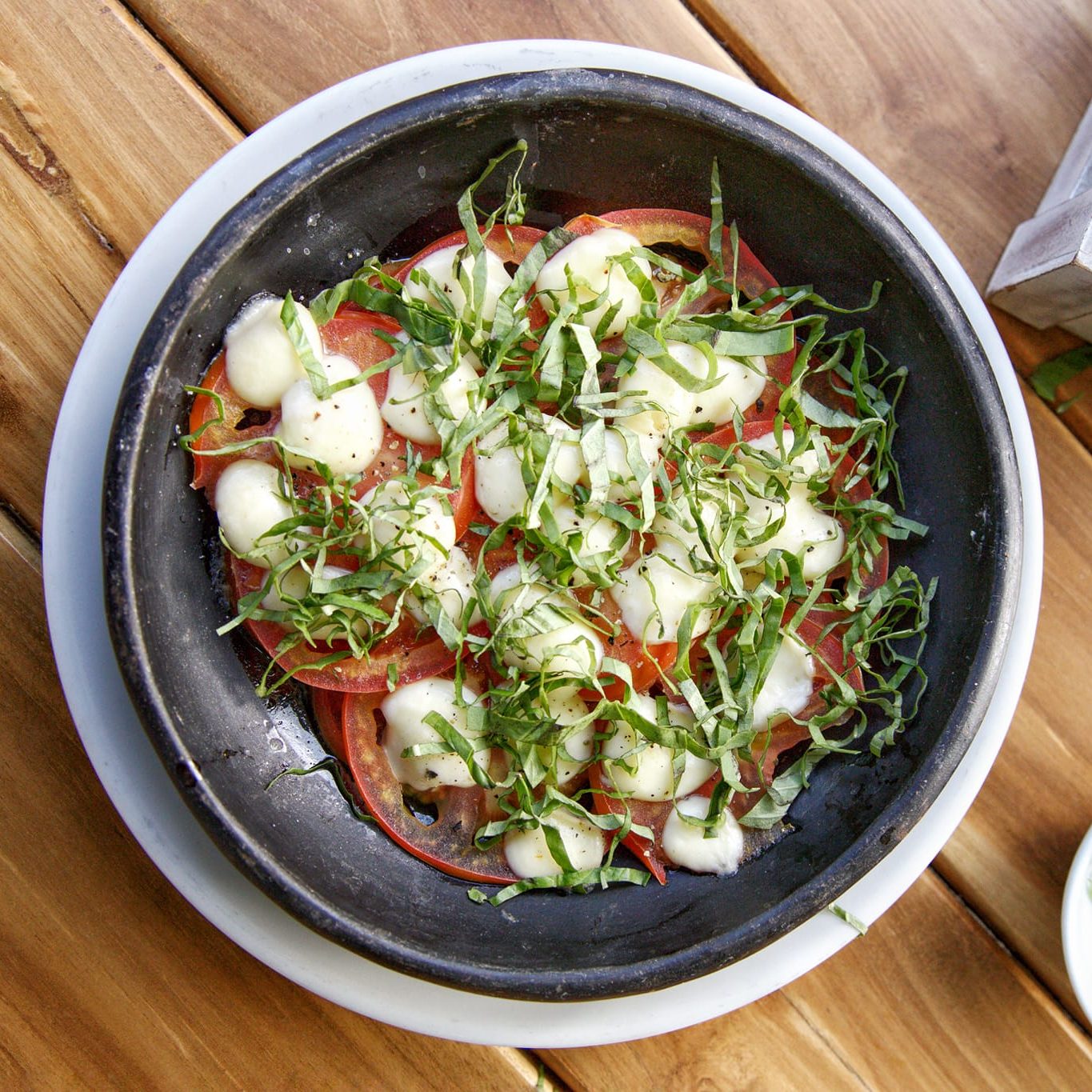Tradicional Ensalada Italiana de Tomates Frescos Albahaca, Aceite de Oliva y Bocconcini Mozzarella Gratinada o Fría.